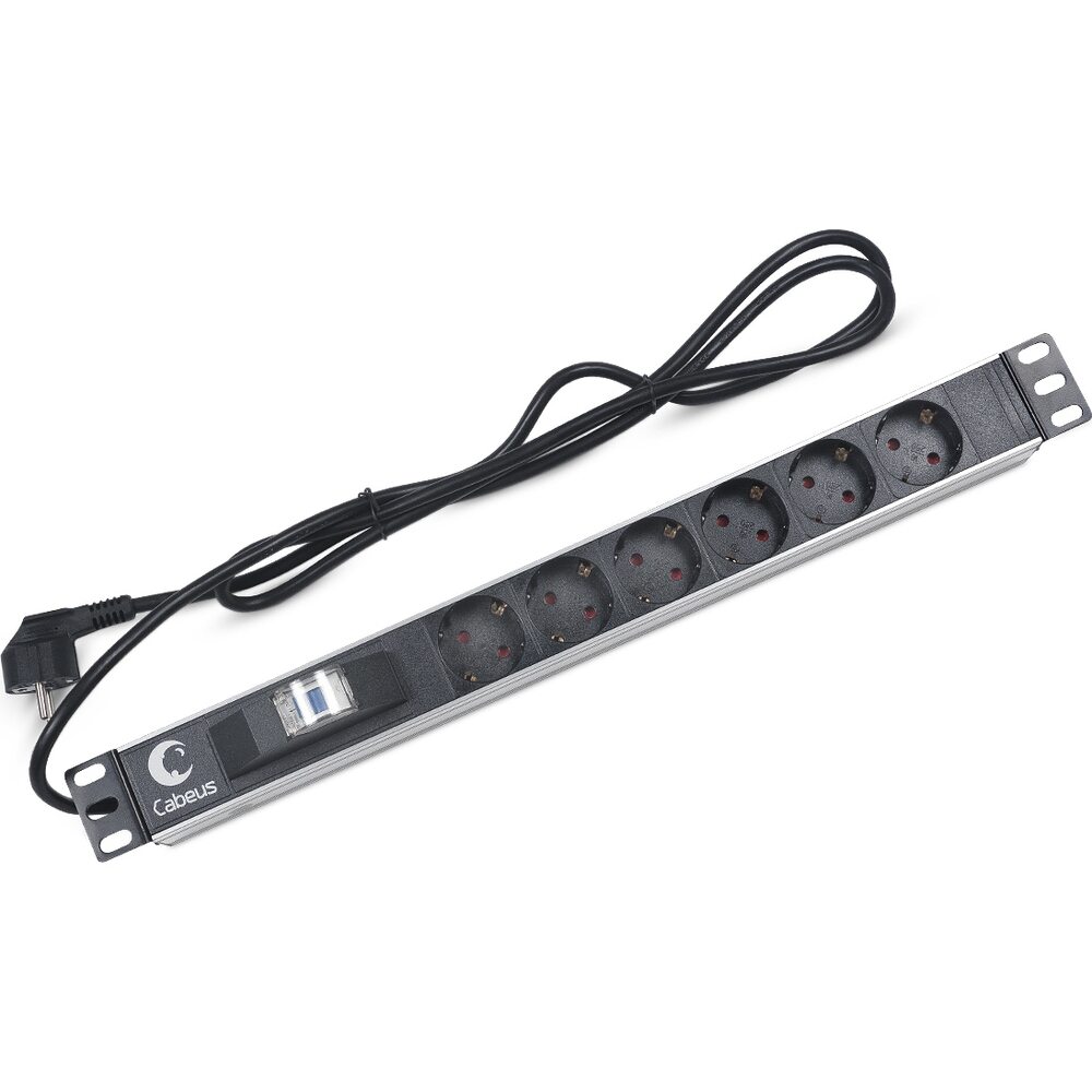 Cabeus PDU-6P-B-2EU Блок евророзеток для 19 шкафов, горизонтальный, 6 розеток, автомат защиты 16 A , шнур 2м, алюминиевый корпус, немецкий стандарт