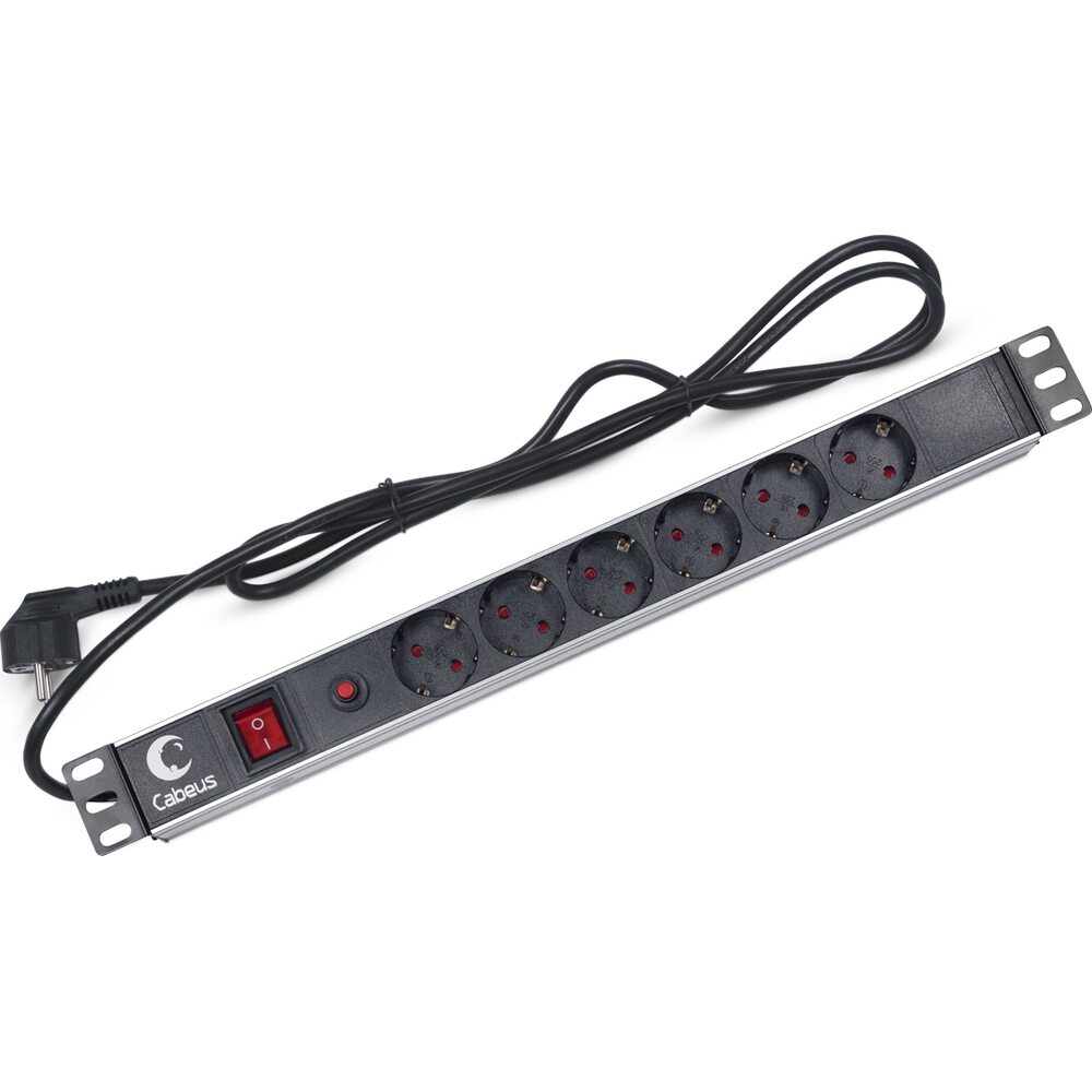 Cabeus PDU-6P-F-2EU Блок евророзеток для 19 шкафов, горизонтальный, 6 розеток, фильтр, 16 A, выключатель, шнур 2м, алюминиевый корпус, немецкий стандарт