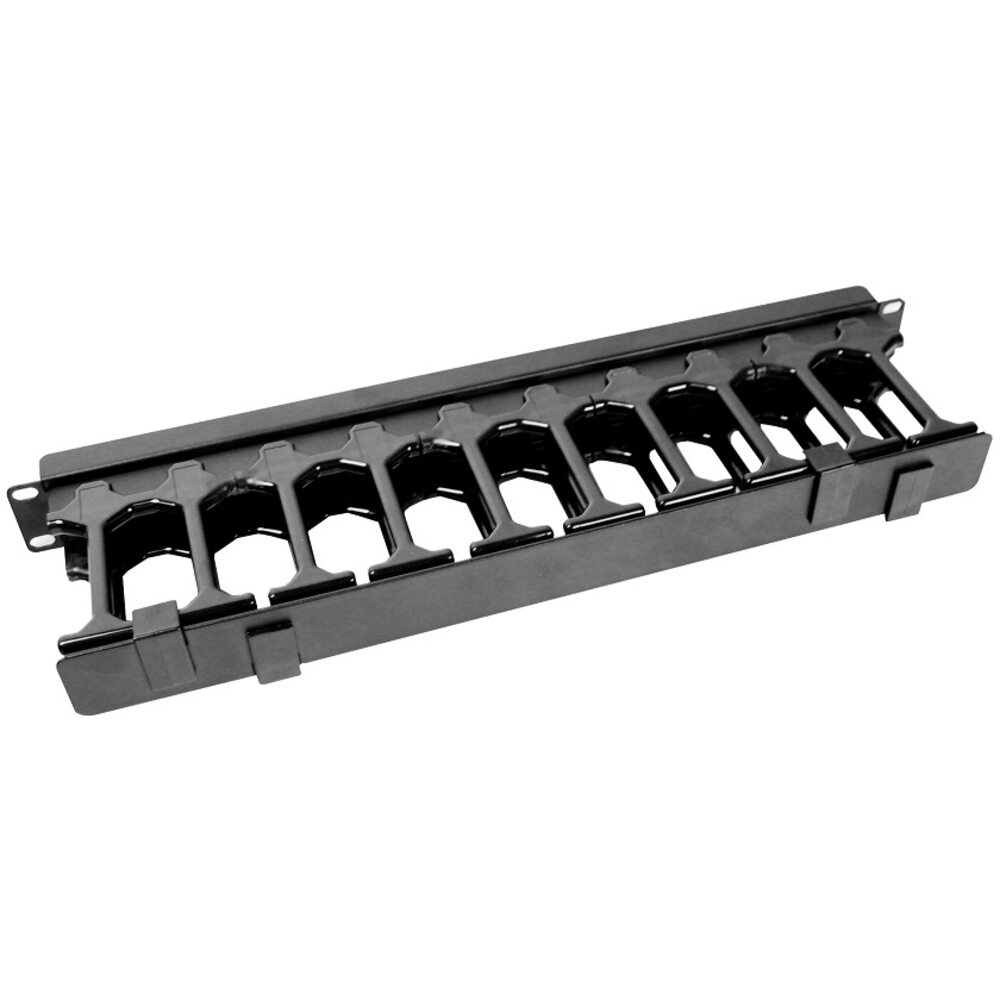 Крышка с защёлкивающимися петлями обеспечивает легкий доступ к кабелю, а гладкие пластиковые штифты правильный радиус изгиба. Высота органайзера 1U.