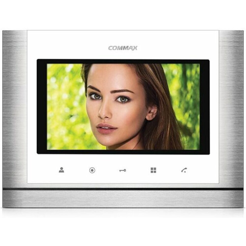 Commax CDV-70M цветной видеодомофон без трубки (hand-free). Экран: 7 дюймов (17,78 см) LCD TFT с LED-подсветкой, обеспечивающей чёткое и насыщенное изображение. Рассчитан на подключение двух цветных вызывных панелей стандарта PAL или NTSC (автоматическое определение). Переключение видеовходов осуществляется повторным нажатием на кнопку просмотра изображения.