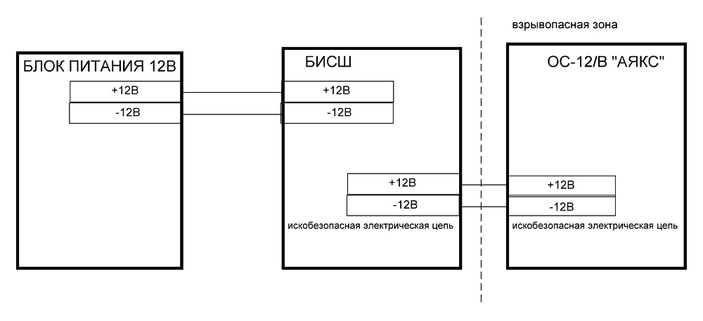 При отсутствии у прибора или источника питания, выхода, обеспечивающего искробезопасную электрическую цепь i, оповещатель ОС-12/В «АЯКС» может подключаться через барьер искрозащиты шлейфа «БИСШ» АТФЕ.426439.001ТУ.