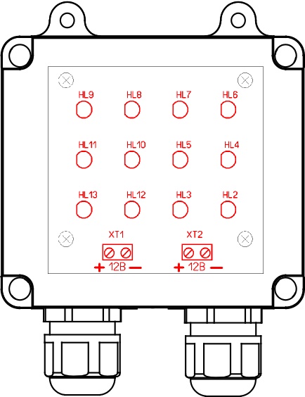 Внутри корпуса имеется печатная плата с радиоэлементами на которой у становлены 2 дублированных коммутационных клеммника, для подключения внешнего питания.