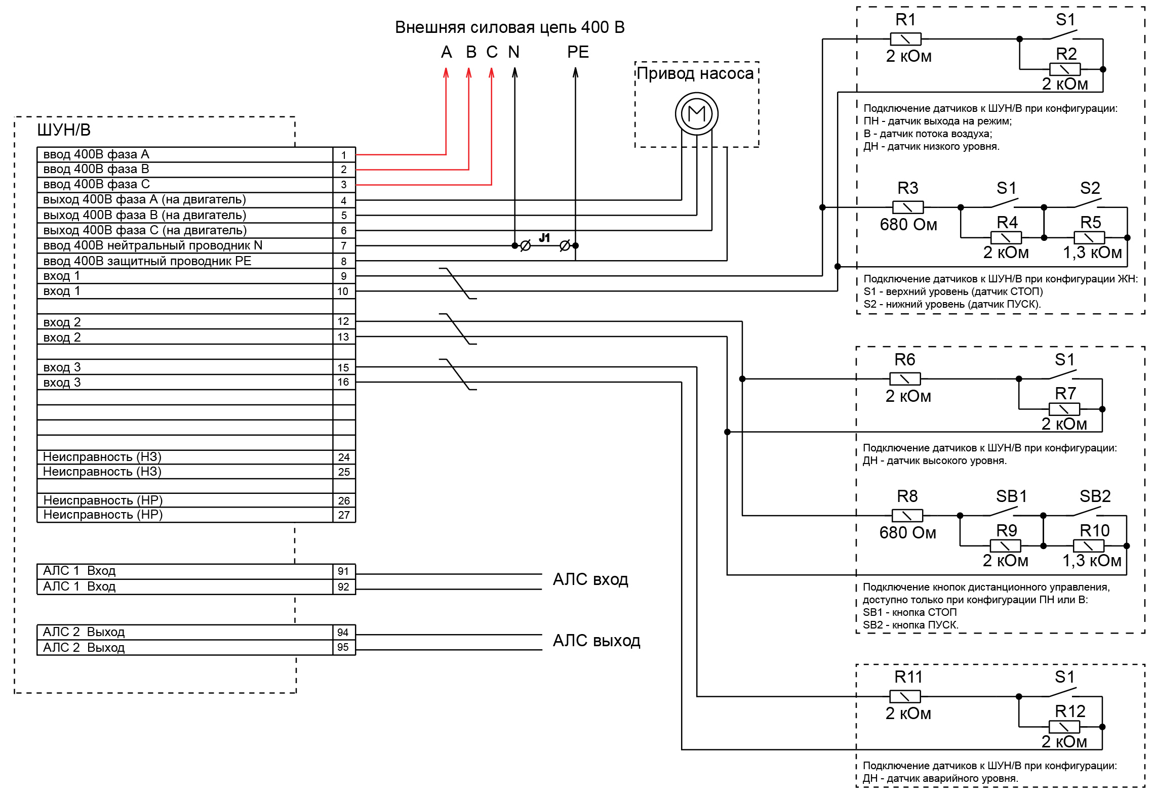 ШУН/В прот.R3 управляет электродвигателем через магнитный контактор. Включение и отключение магнитного контактора возможно в автоматическом режиме управления командными импульсами встроенного в шкаф контроллера по сигналу с приемно-контрольного прибора ППКПУ и в ручном режиме управления с помощью кнопок шкафа без участия контроллера.