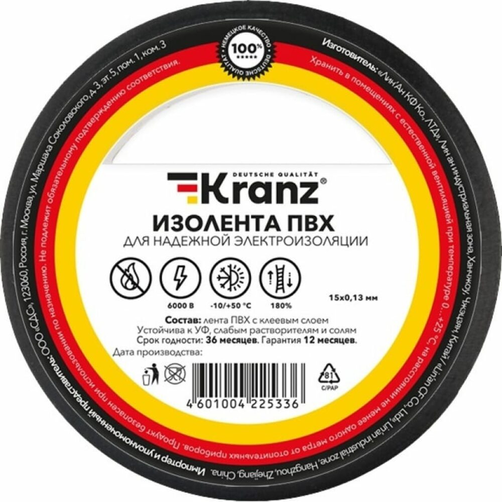 Изолента ПВХ KRANZ 15 мм х 25 м, 0.13 мм, черная KR-09-2106 предназначена для электрической изоляции, цветной маркировки, соединения, защиты от внешних факторов и герметизации кабелей, проводов и шнуров. Обеспечивает высокое качество обмотки и защищает места соединения от влаги, пыли, грязи, механических повреждений и перепадов температуры окружающей среды. Выполнена из высококачественной ПВХ-пленки с клеевым слоем.