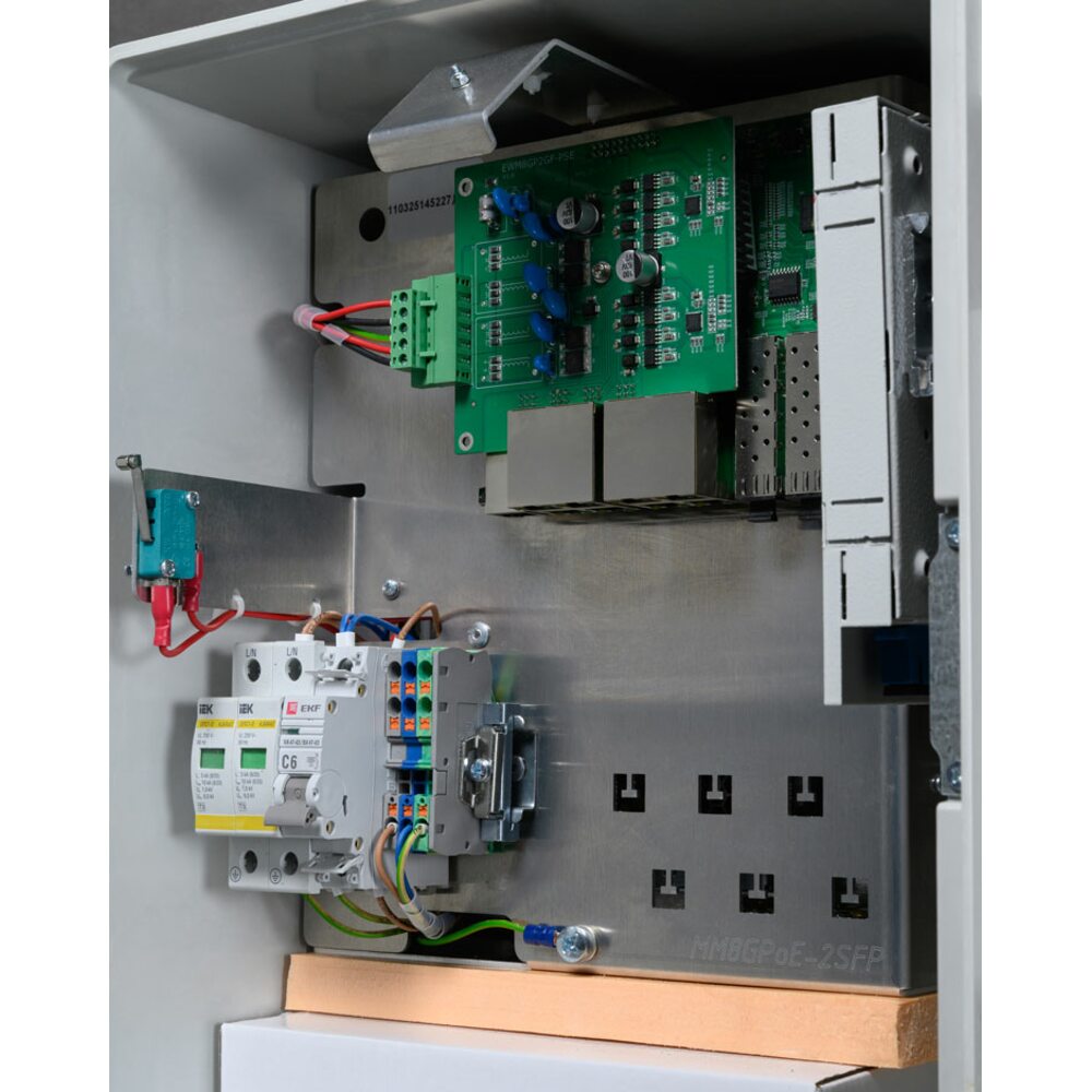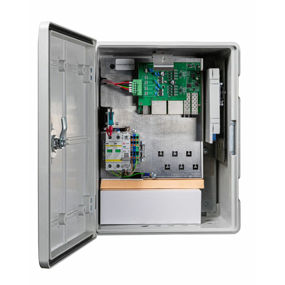 Коммутатор сетевой 10 портовый гигабитный управляемый уличный с РоЕ; 8xRJ-45 PoE 10/100/1000 Мбит/с, IEEE 802.3af/at, 2xSFP Uplink 10/100/1000 Мбит/с; PoE бюджет до 240 Вт; метод подачи питания А; AI PoE(watchdog)/Vlan; дальность передачи до 250 метров; грозозащита, защита от КЗ, IK10, IP66; -60... +50°C; 334х417х200 мм.