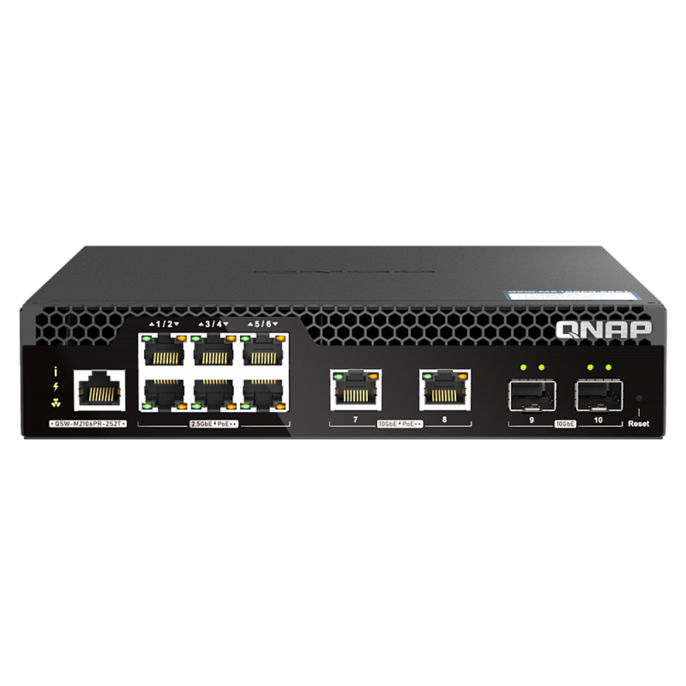 Благодаря компактному металлическому корпусу и эффективному охлаждению, QSW-M2106PR-2S2T обеспечивает стабильную и надежную работу даже при полной нагрузке. Светодиоды на передней панели помогают контролировать текущее состояние системы.
