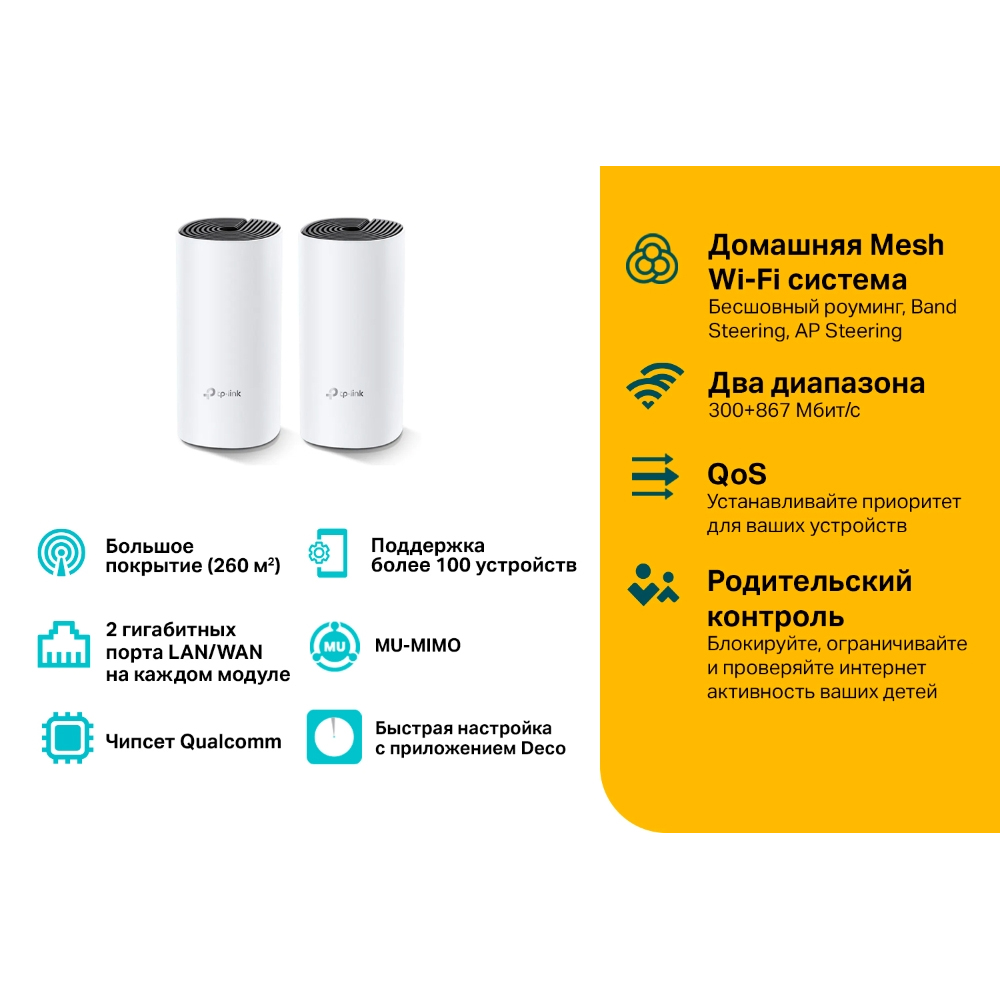- Комплект Deco M4 с двумя устройствами обеспечивает покрытие до 260 кв.м. Если этого недостаточно – просто добавьте в сеть больше модулей Deco для увеличения покрытия (также возможен комплект из трёх модулей).