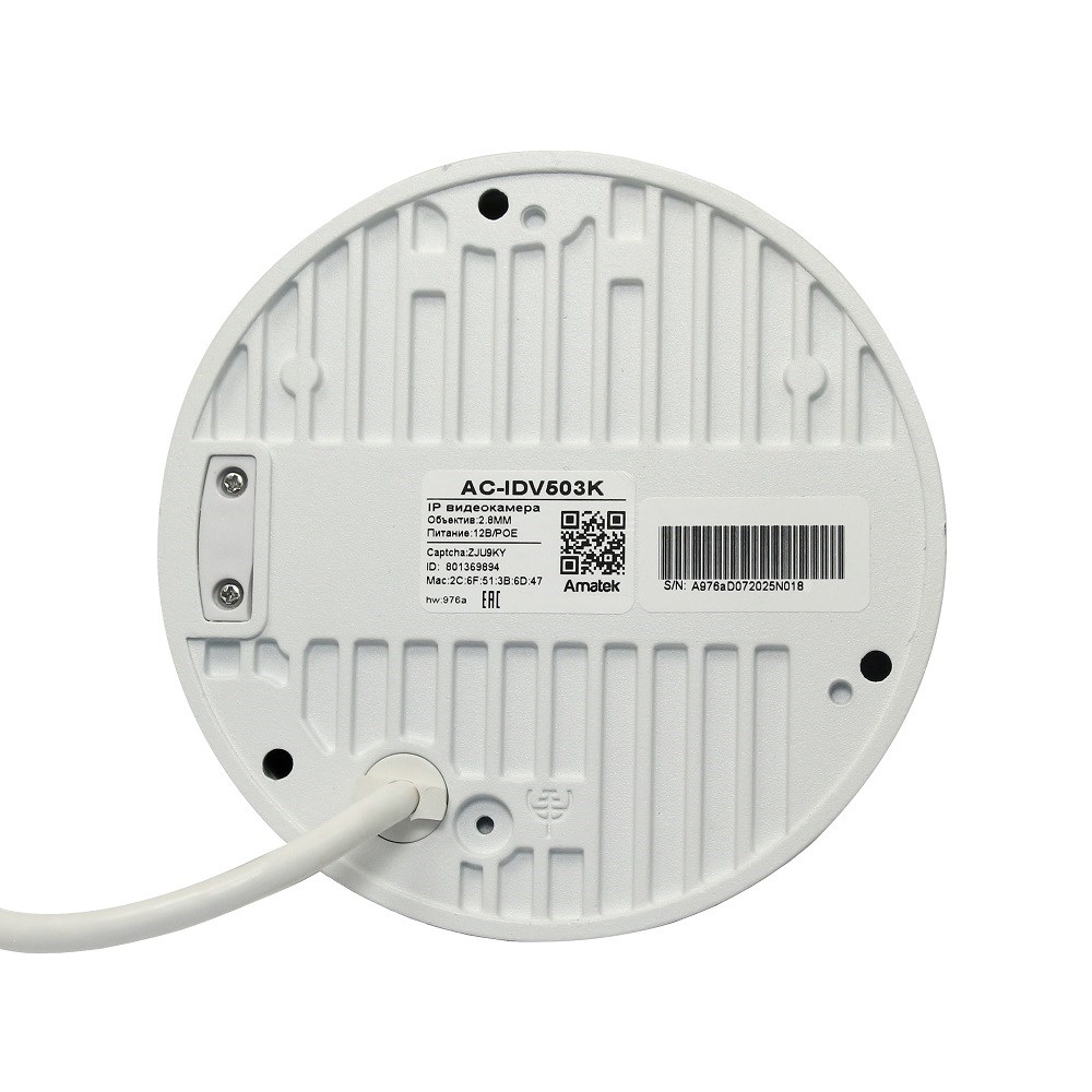 Питание от блока питания DC12В/1000мА или по технологии PoE (802.3af). Корпус имеет размеры Ø110 x 63 мм и класс зашиты IP67. Рабочая температура -40...+60 C, вес 0,6 кг. Комплект поставки: камера, монтажный комплект, паспорт.