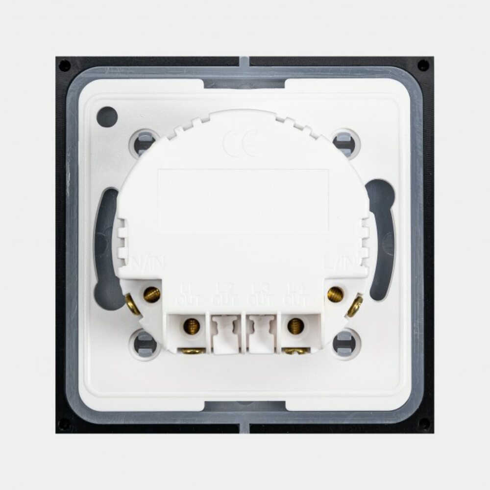 5. Отключите сеть питания выключателей. Отсоедините верхнюю крышку от основания выключателя. Подключите к основанию выключателя питание в нужные разъѐмы. L?фаза, L1 (L2, L3, L4) - линии управления освещением (в зависимости от модели), N-ноль. Зафиксируйте провода питания болтами, установите выключатель в подрозетник и закрепите. Далее наденьте внешнюю крышку и надавите, чтобы она плотно прилегла к основанию и закрепилась.