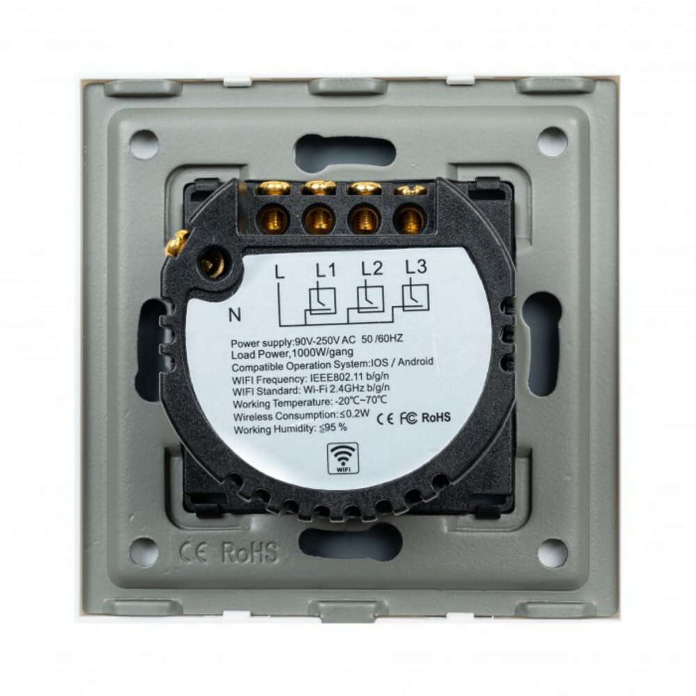 5. Отключите сеть питания выключателей. Отсоедините верхнюю стеклянную крышку от основания выключателя. Подключите к основанию выключателя питание в нужные разъѐмы (L - фаза, N ноль, L1, L2, L3 - линии управления освещением. Количество линий управления соответствует количеству клавиш на выключателе). Зафиксируйте провода питания болтами, установите выключатель в подрозетник и закрепите. Далее наденьте внешнюю крышку и надавите, чтобы она плотно прилегла к основанию и закрепилась.