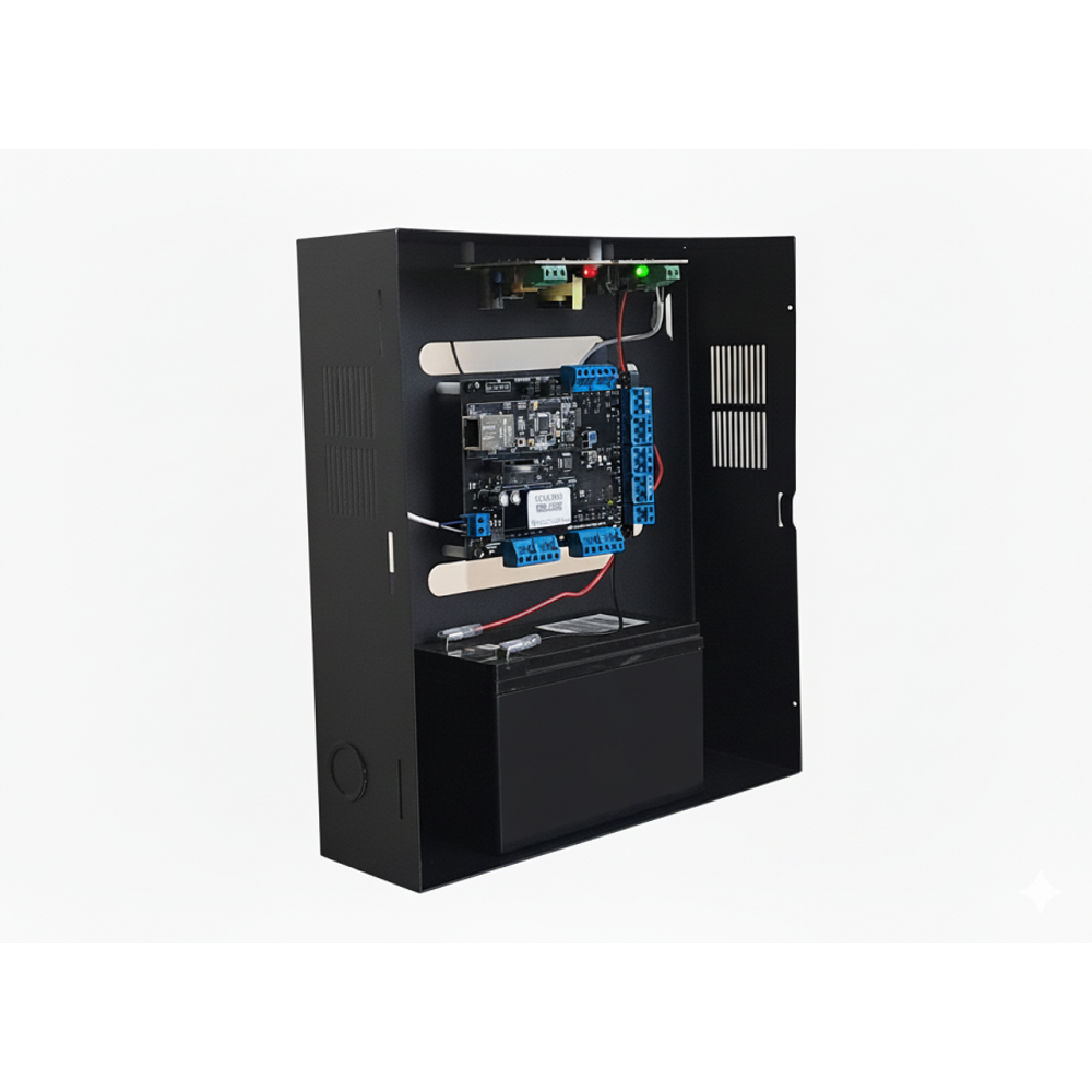 Контроллер оборудован двумя входами для подключения считывателей с интерфейсами 'Wiegand' или 'Touch Memory'. Он может функционировать как автономное устройство, так и в составе сети, что делает его гибким решением для различных задач безопасности. В комплекте также поставляется программное обеспечение Server для упрощенной настройки и управления системой.