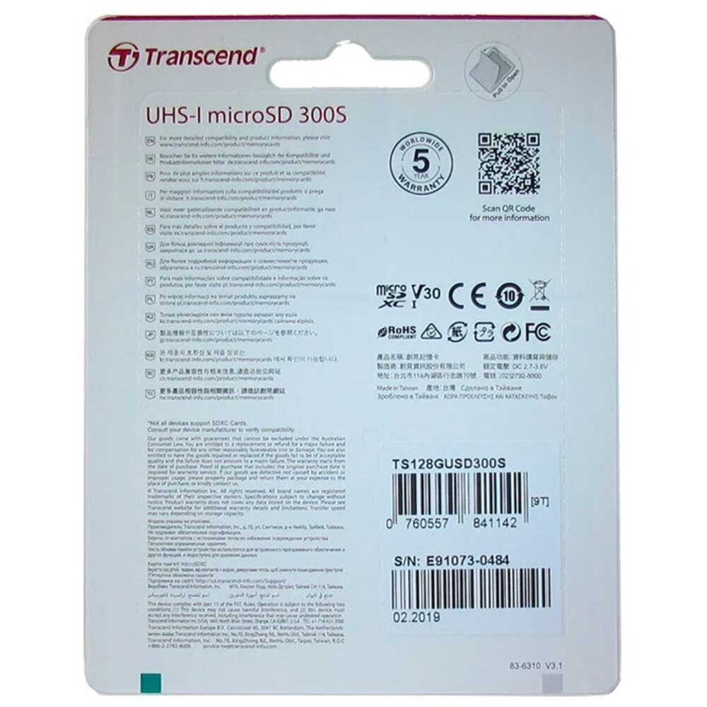 Карты памяти Transcend microSDXC/SDHC 300S соответствуют как стандарту UHS Speed Class 3 (U3), так и требованиям UHS Video Speed Class 30 (V30) для записи видео в формате 4K Ultra HD, обеспечивая скорости чтения и записи до 100 и 85 МБ/с, соответственно.