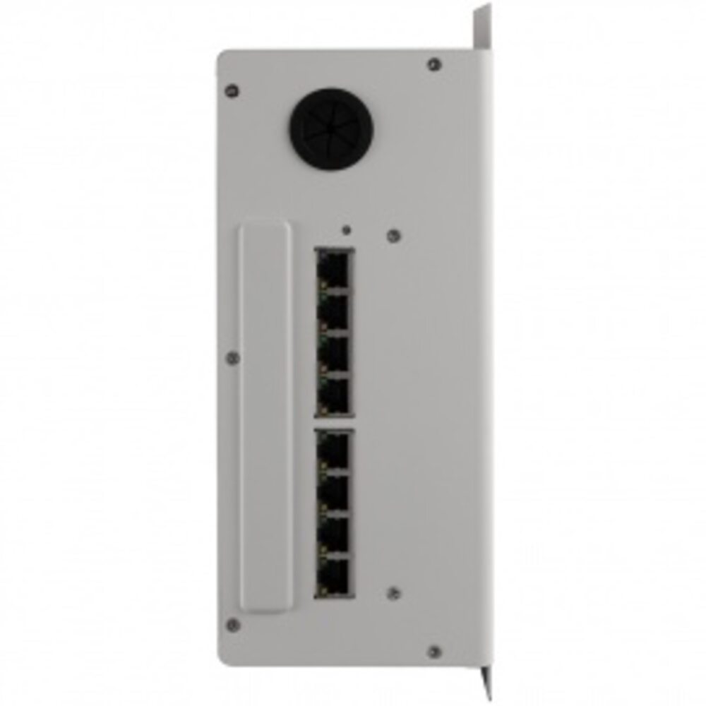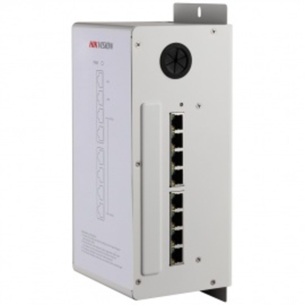 Hikvision DS-KAD606 - PoE-коммутатор оборудован 8 портами RJ-45 10/100 Мб/с. 6 каналов для передачи данных и питания устройств (мониторы/вызывные панели) по витой паре и 2-канальное каскадирование LAN. На «борту» присутствует встроенный стабилизатор напряжения.
