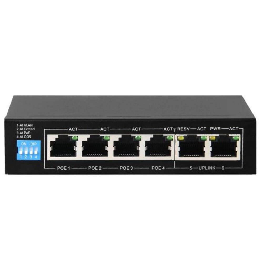 J2000-NET-SW04P2Ui - 4-х канальный PoE коммутатор(свитч), 6 портов (2 RG45 + 4 PoE), 15,4W на канал (Общая мощность - 60W), 10/100 Mb. Интеллектуальные функции: CCTV Extend- передача сигнала на растояние до 250м (10Mb).