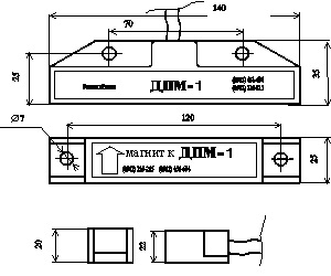 - Контакты датчика гарантированно замыкаются при расстояннии между датчиком и магнитом 25 мм и удерживаются замкнутыми на расстоянии до 40 мм, и гарантированно разомкнуты на расстоянии 70 мм (ДПМ-1).