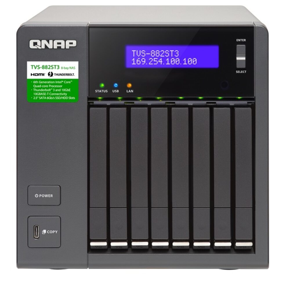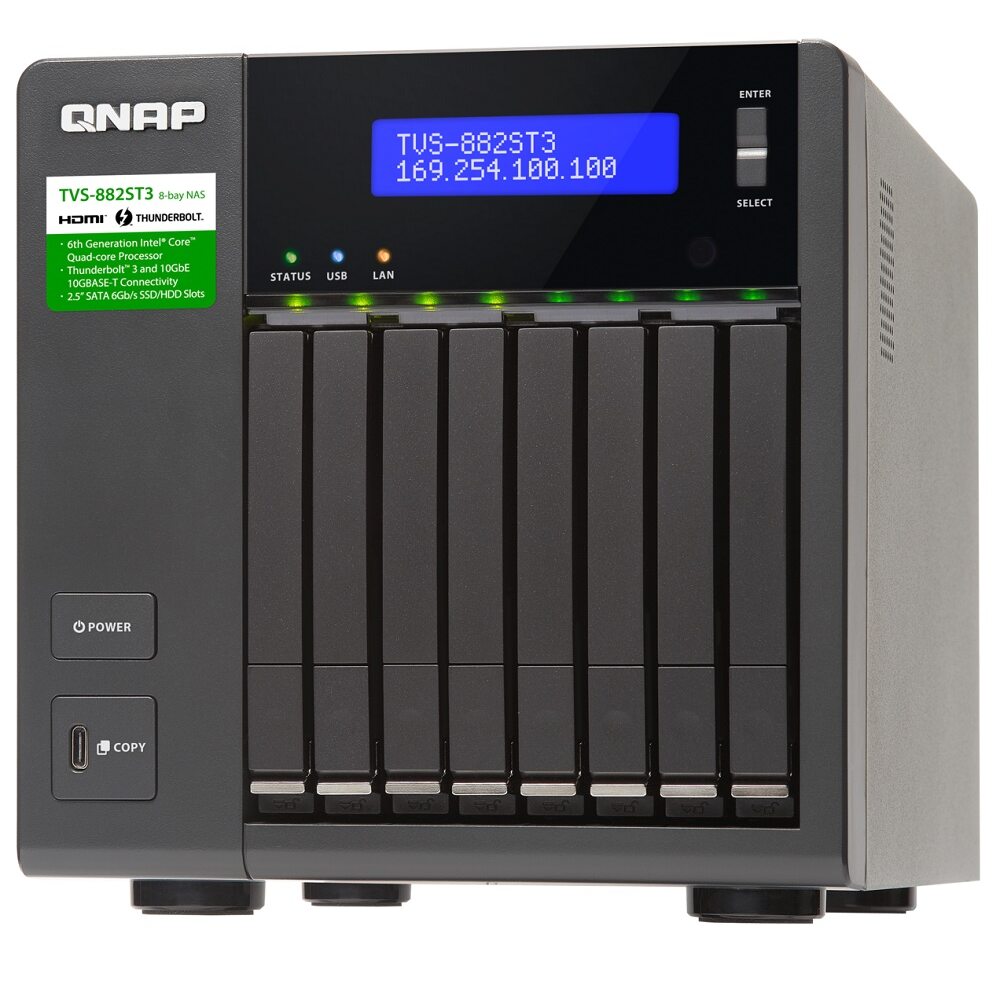 QNAP TVS-882ST3 — первая в мире система хранения, способную выступать одновременно в роли DAS, NAS и iSCSI SAN: тройное решение, оснащенное портом Thunderbolt 3 со скоростью 40 Гбит/с. Устройство является универсальным хранилищем данных как для пользователей Mac, так и для тех, кто интенсивно работает в Windows-среде с различным медиаконтентом, например видеозаписями сверхвысокой четкости 4К. Оснащенное операционной системой QTS для сетевых накопителей QNAP, устройство идеально подойдет для резервного копирования данных, синхронизации файлов, безопасного удаленного доступа, а также надежного личного облака.