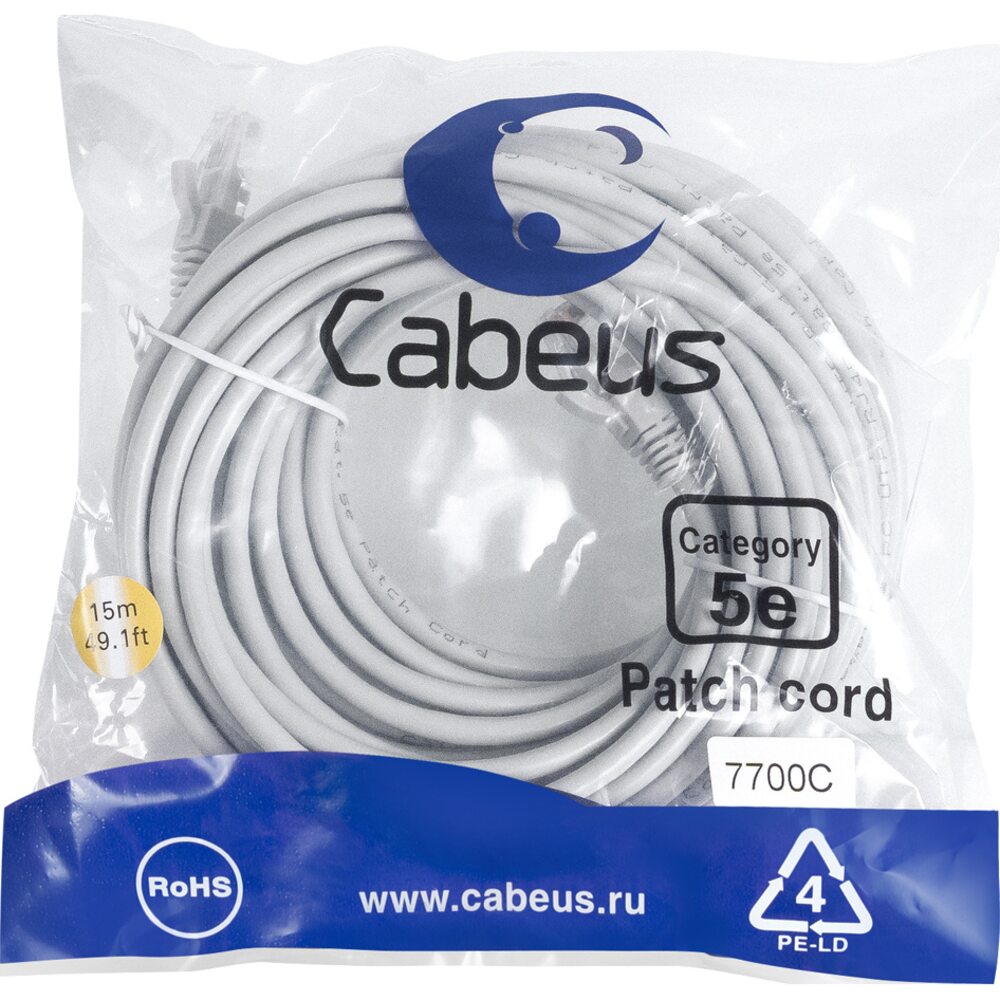 Cabeus PC-UTP-RJ45-Cat.5e-15m Патч-корд U/UTP, категория 5е, 2xRJ45/8p8c, неэкранированный, серый, PVC, 15м