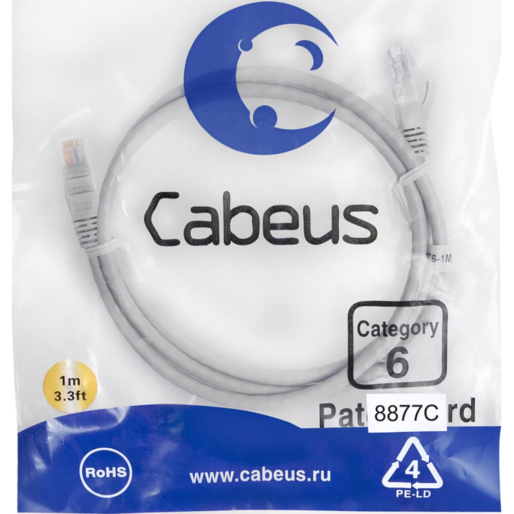 Cabeus PC-UTP-RJ45-Cat.6-1m-LSZH Патч-корд U/UTP, категория 6, 2xRJ45/8p8c, неэкранированный, серый, LSZH, 1м