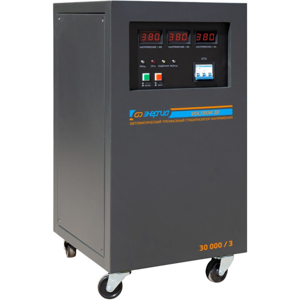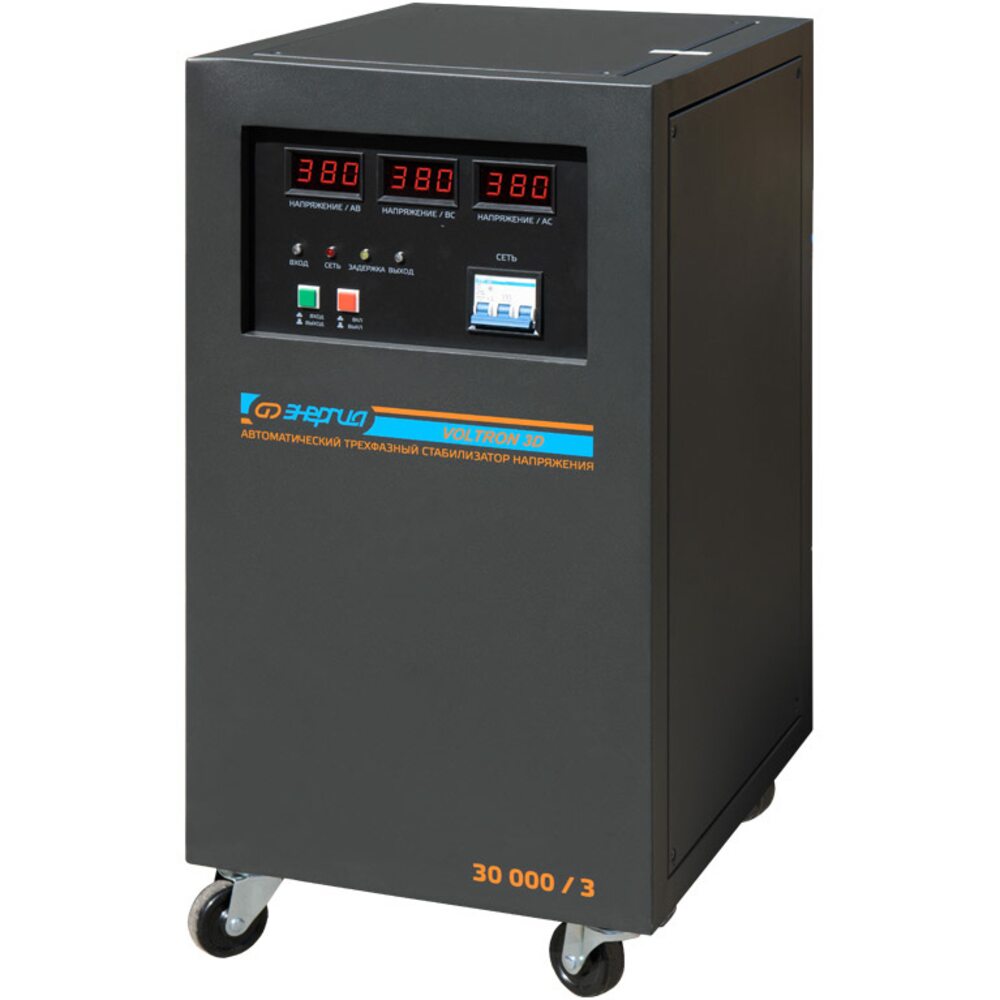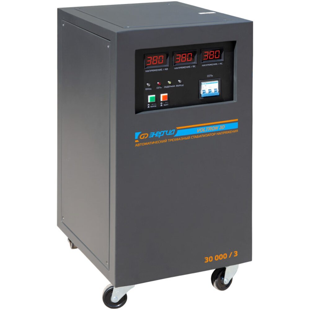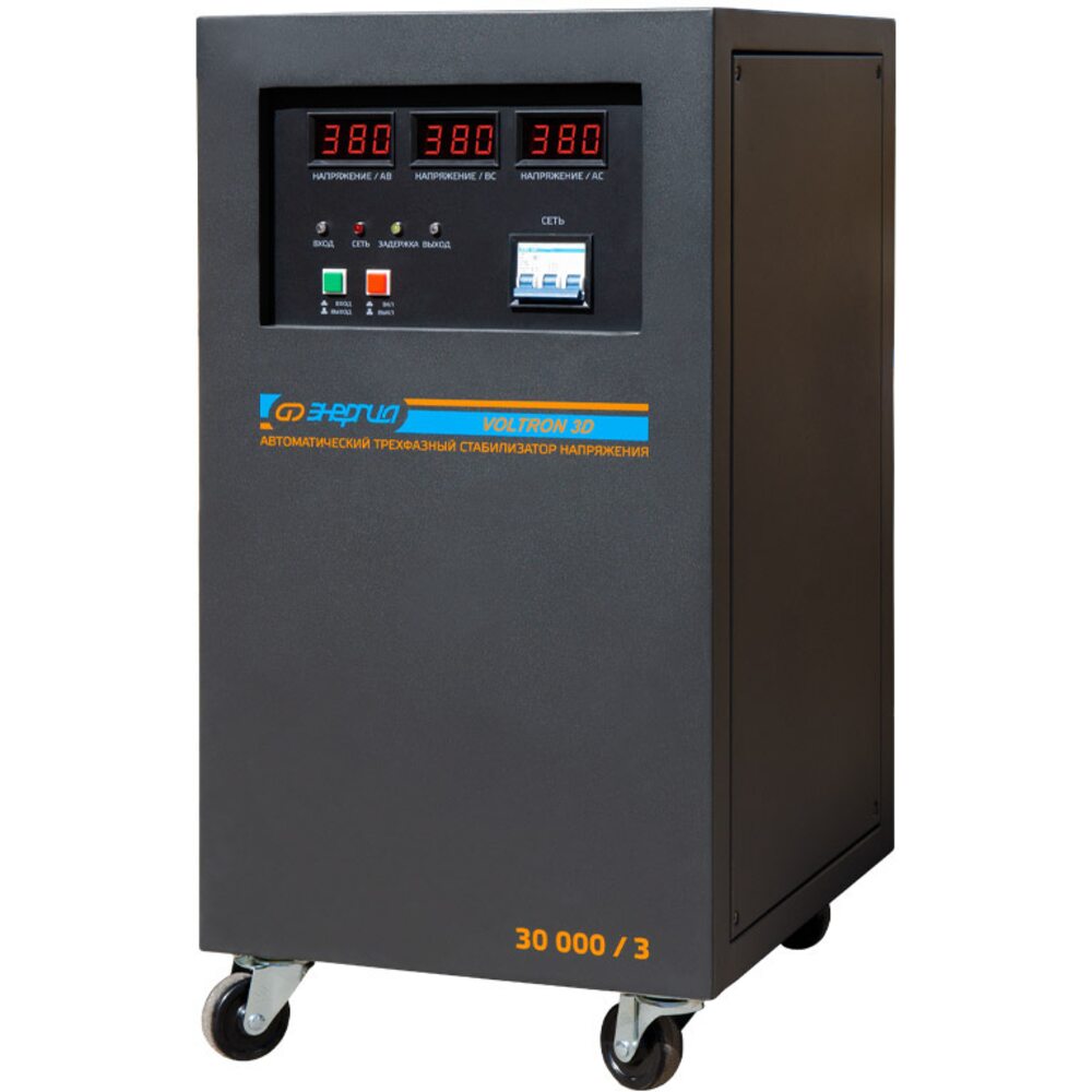 Стабилизатор напряжения Энергия Voltron 3D 30000/3. Стабилизатор предназначен для поддержания величин фазных и линейных напряжений в трехфазной сети в пределах 3 % допуска в цепях электроснабжения потребителей промышленного и аналогичного назначения в сухих помещениях без источников пыли, химически активных веществ и взрывоопасных газов. Использование стабилизатора в средах с повышенной опасностью запрещено.