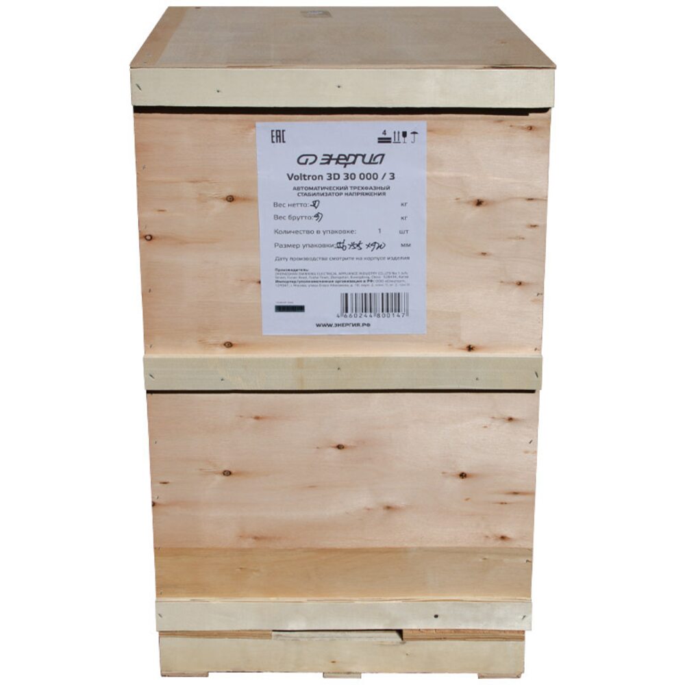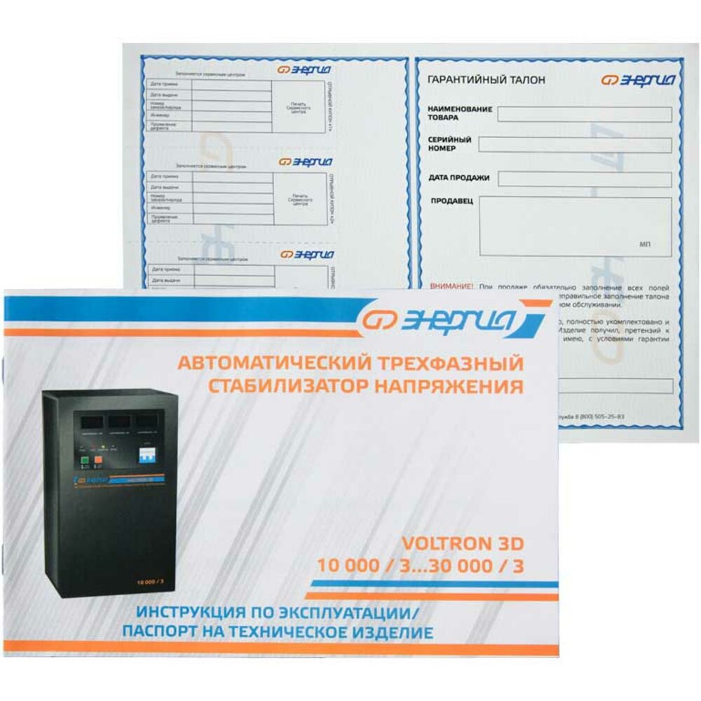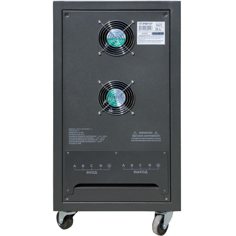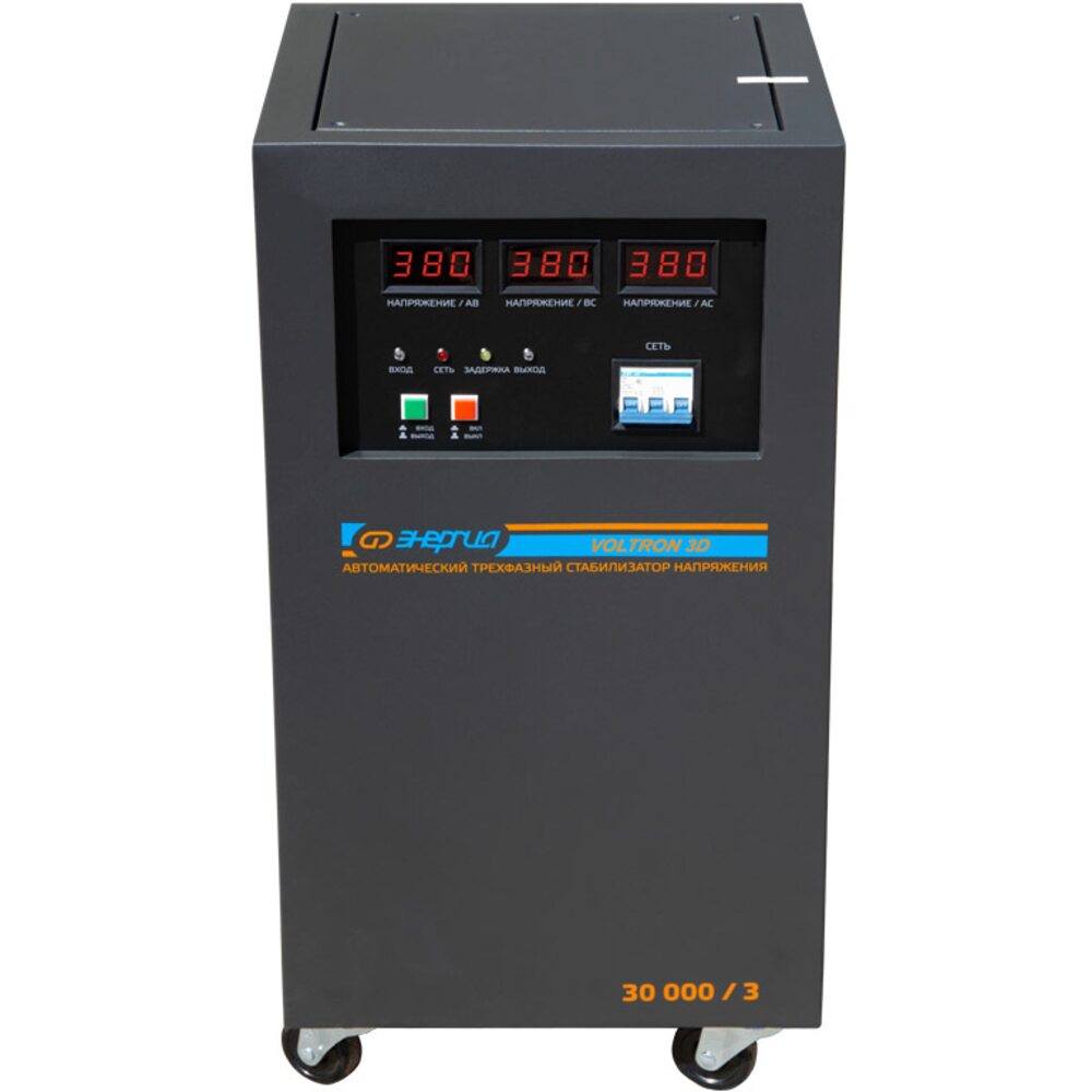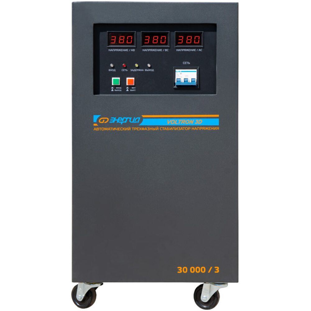 Стабилизатор напряжения Энергия Voltron 3D 30000/3. Стабилизатор предназначен для поддержания величин фазных и линейных напряжений в трехфазной сети в пределах 3 % допуска в цепях электроснабжения потребителей промышленного и аналогичного назначения в сухих помещениях без источников пыли, химически активных веществ и взрывоопасных газов. Использование стабилизатора в средах с повышенной опасностью запрещено.