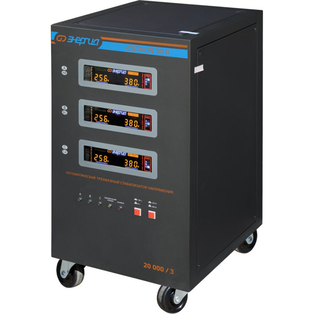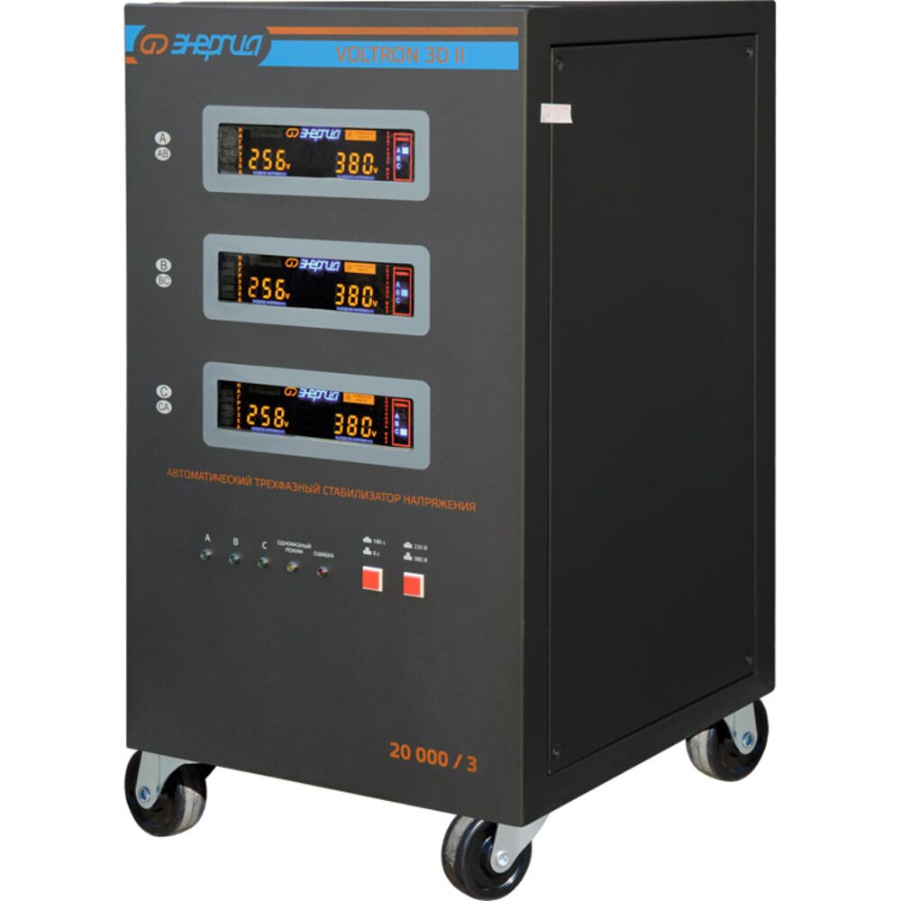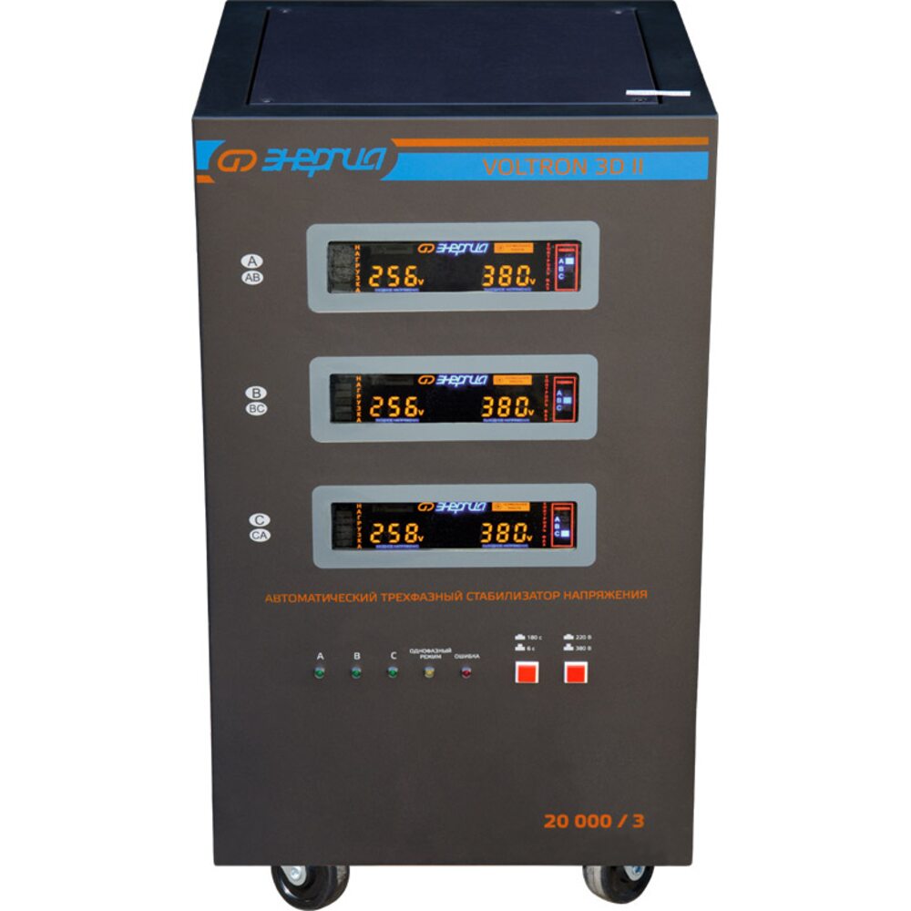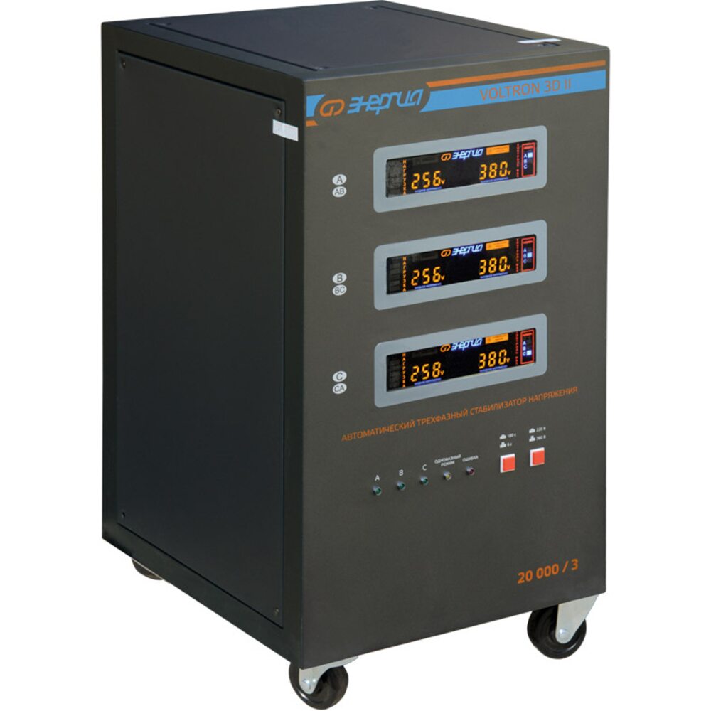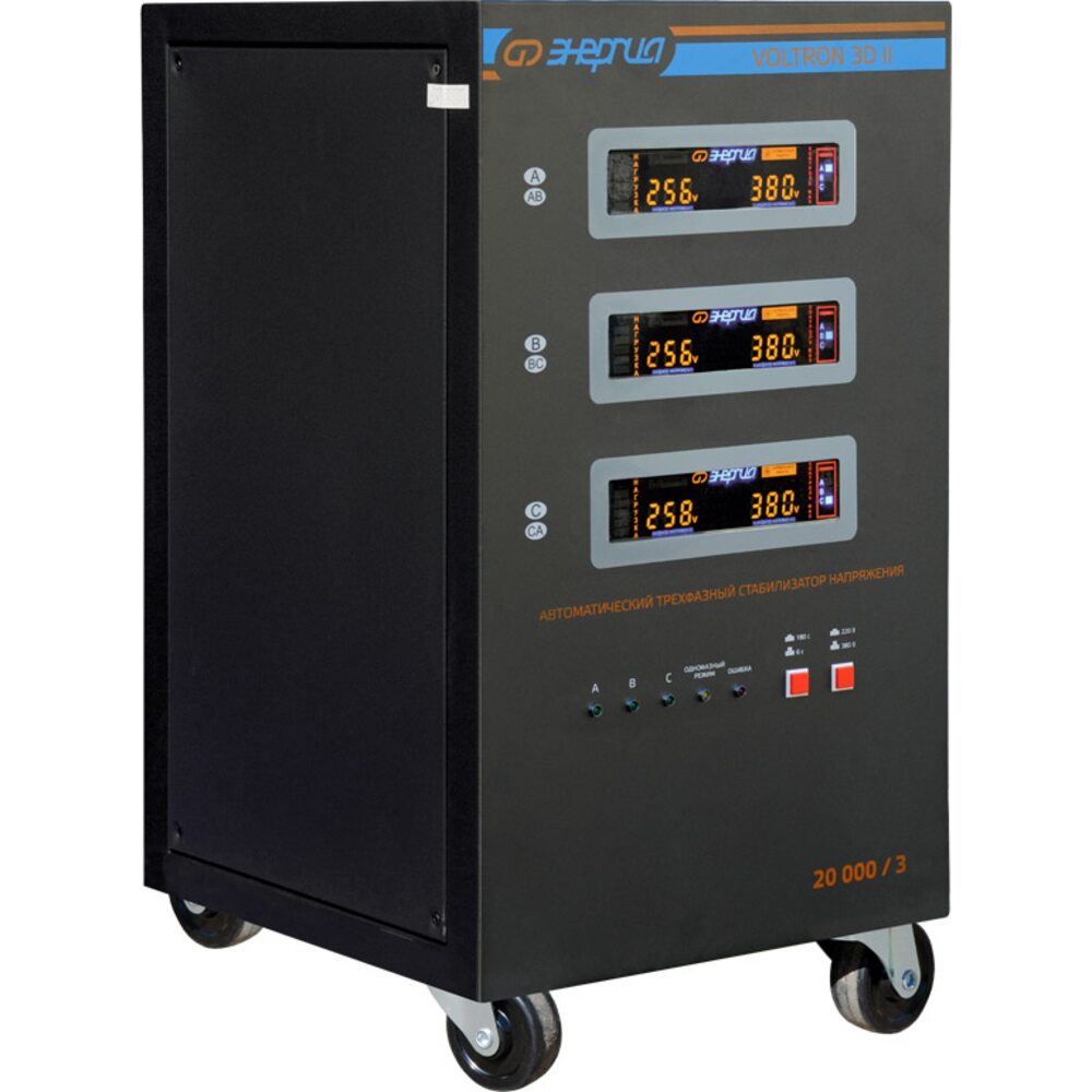 В обновлённой линейке трёхфазных стабилизаторов напряжения Энергия VOLTRON 3D II возможен выбор работы стабилизатора либо в трёхфазном режиме работы (для 3фазных потребителей), либо в 1-фазном режиме работы.