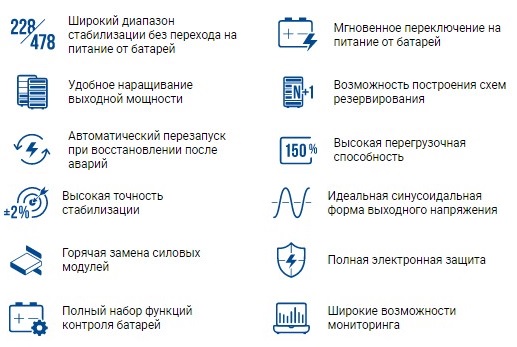 - Перегрузочная способность (при работе в режиме on-line или от батарей): 110% - в течение 1 часа, 125% - в течение 10 минут, 150% - в течение 1 минуты, более 150% - в течение 200 мс