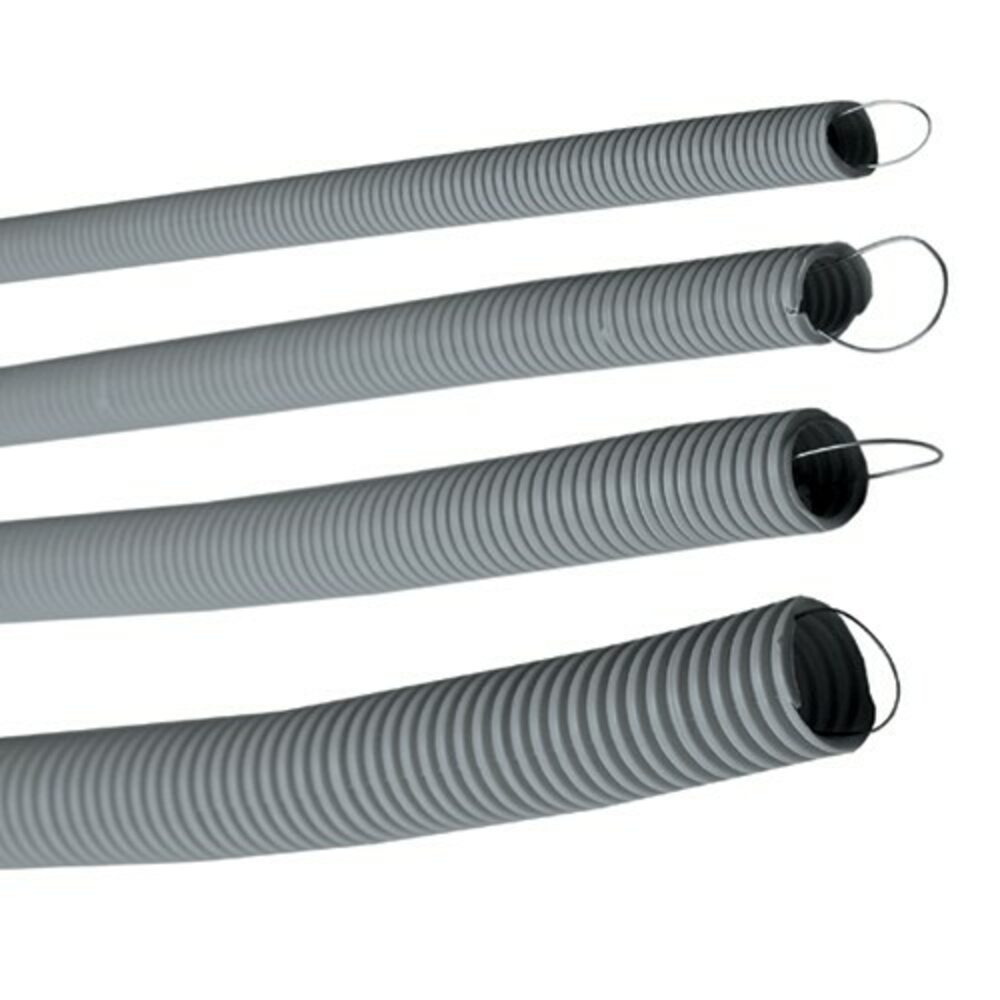 Труба ПВХ гофрир. легкая, с зондом D = 25 (50 м) - труба легкая гофрированная с протяжкой, цвет серый ПВХ, D = 25 мм предназначена для одиночной прокладки в них скрытым, полускрытым, открытым способами в стационарных электроустановках бытового и аналогичного назначения, эксплуатируемых как внутри помещений, так и на открытом воздухе электрических, телефонных, компьютерных, телевизионных сетей, работающих при электрическом напряжении постоянного или переменного тока величиной не более 1000 вольт и выполненных изолированными проводами, шнурами и кабелями негорючими или слабогорючими. Гофрированные трубы ПВХ (гофра ПВХ) изготавливаются из высококачественной композиции ПВХ. Использование гофротрубы ПВХ значительно сокращает временные затраты на организацию электропроводки.