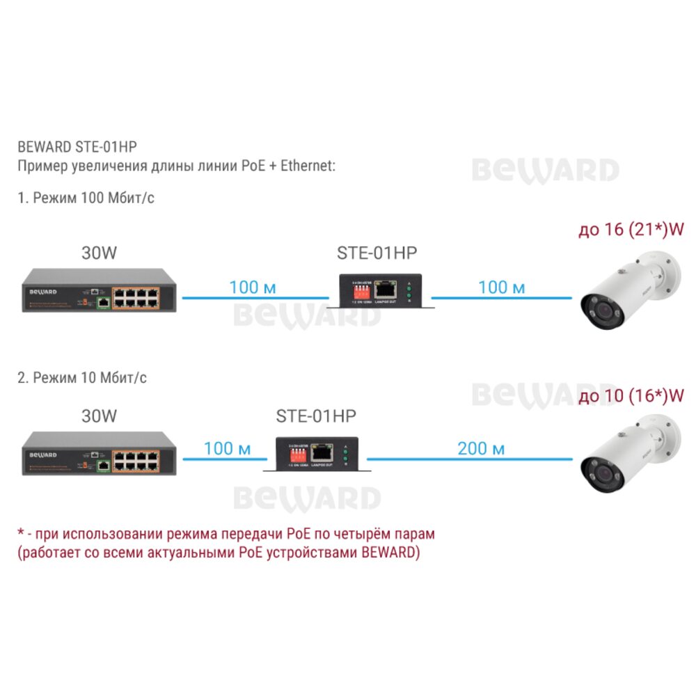 Устройство поддерживает питание камер и других устройств с энергопотреблением до 16 Ватт на линии 200 метров или до 10 Ватт на линии 300 метров по стандартным протоколам PoE 802.3 af/at, где для передачи питания используются 4 жилы витой пары. Если этого мало, с помощью четырёхпозиционного DIP-переключается можно активировать метод передачи PoE по восьми жилам (PoE af/at метод A + B). Таким образом репитер позволит запитать устройства с энергопотреблением по PoE до 21 Ватта на линии 200 метров или до 16 Ватт на линии 300 метров. Данный режим поддерживается всеми актуальными камерами и другими PoE устройствами BEWARD.
