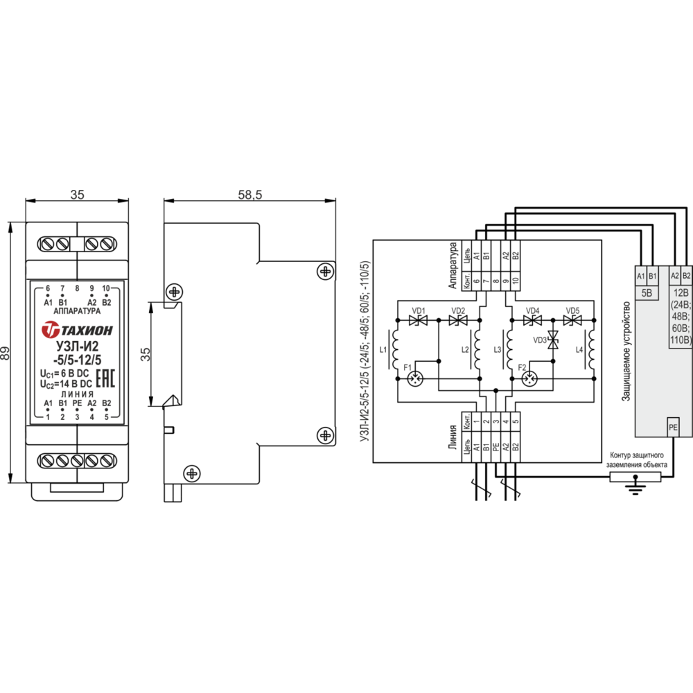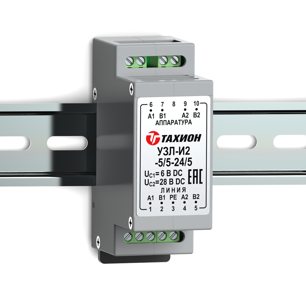 Устройство защиты интерфейсов с подачей питания УЗЛ-И2-5/5-24/5 с двумя каналами предназначено для защиты от импульсных перенапряжений (грозовых, электростатических разрядов и др.) оборудования промышленной автоматизации, диспетчеризации, систем безопасности, использующих 2х проводные линии интерфейса RS-485, RS-422, M-bus, CAN и их разновидностей, в пределах 2-3 зон молниезащиты (в соответствии с МЭК 61312-1). Устройство обеспечивает защиту интерфейса и передачу питания 5 В DC по каналу А1 В1 и 24 В DC по каналу А2 В2 по сигнальным парам с величиной тока до 5 А.