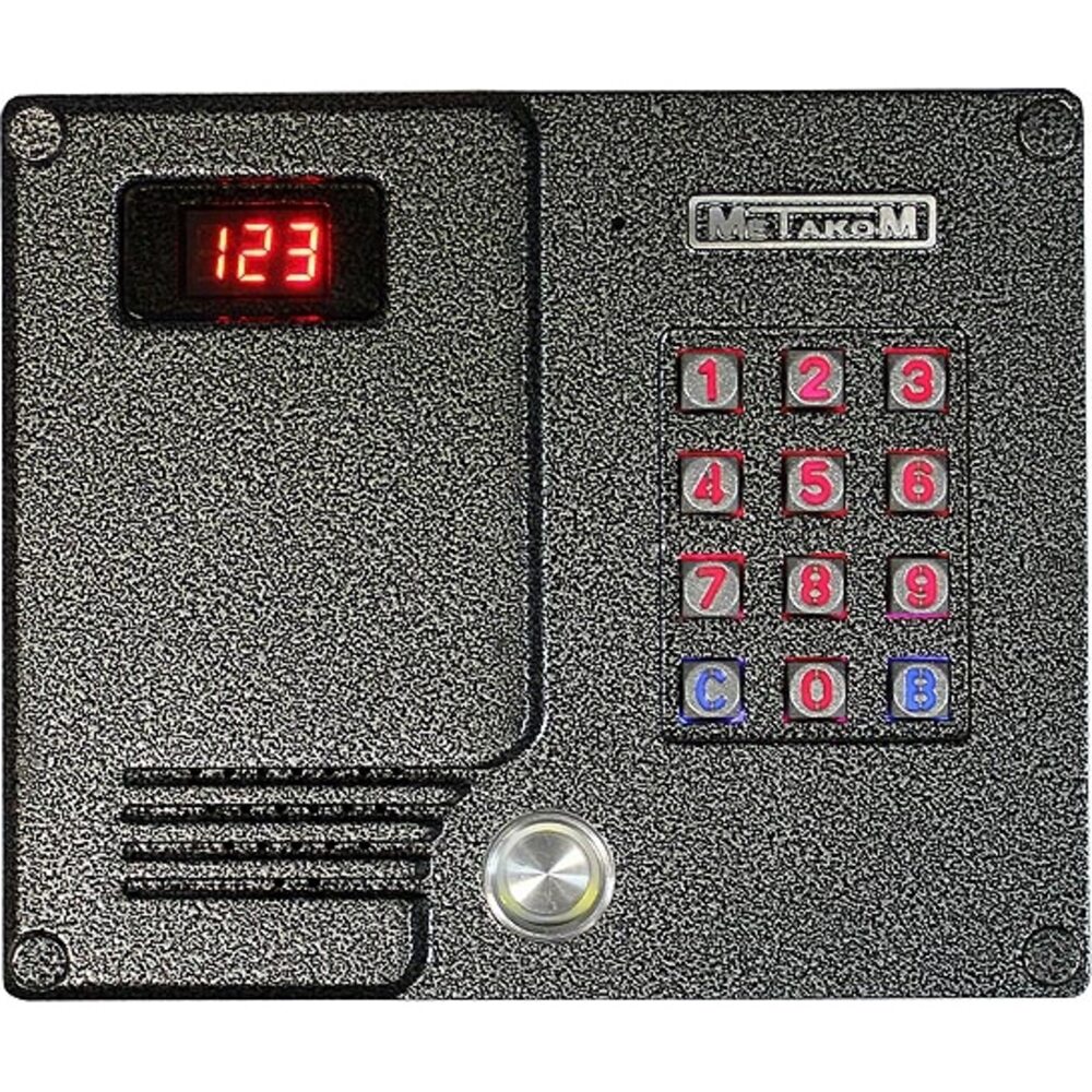 Многоабонентный антивандальный блок вызова METAKOM MK2007-TM-E, цифровая система адресации, ёмкость до 255 абонентов, трёхразрядный цифровой дисплей, контроллер Touch Memory (ключи типа ТМ2002, ТМ2003, ТМ2004, DS 1990A), индивидуальные коды, свето- и аудиоиндикация режимов работы. Рассчитан на работу с электромагнитным замком. Работа с трубками типа: ТКП-12D, LF-8, Wekta.