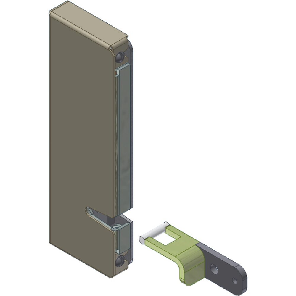 Электромагнитный замок защелка AL-250UZ-D с зацепом для раздвижных дверей и дверей-купе. Устанавливается в накладном варианте. Корпусная часть крепится на дверную коробку и закрывается декоративным кожухом. Зацеп монтируется на дверь.