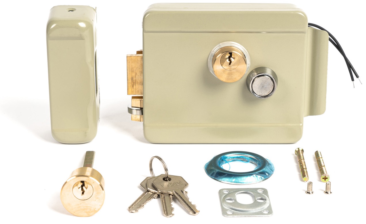Электромеханический замок. Материал корпуса замка сталь с порошковой окраской. Тип установки - накладной. Открывание двери - левое/правое, внутрь/наружу. 12 В, 3 А. от -30 до +50, 150х105х40 мм,1,5 кг.