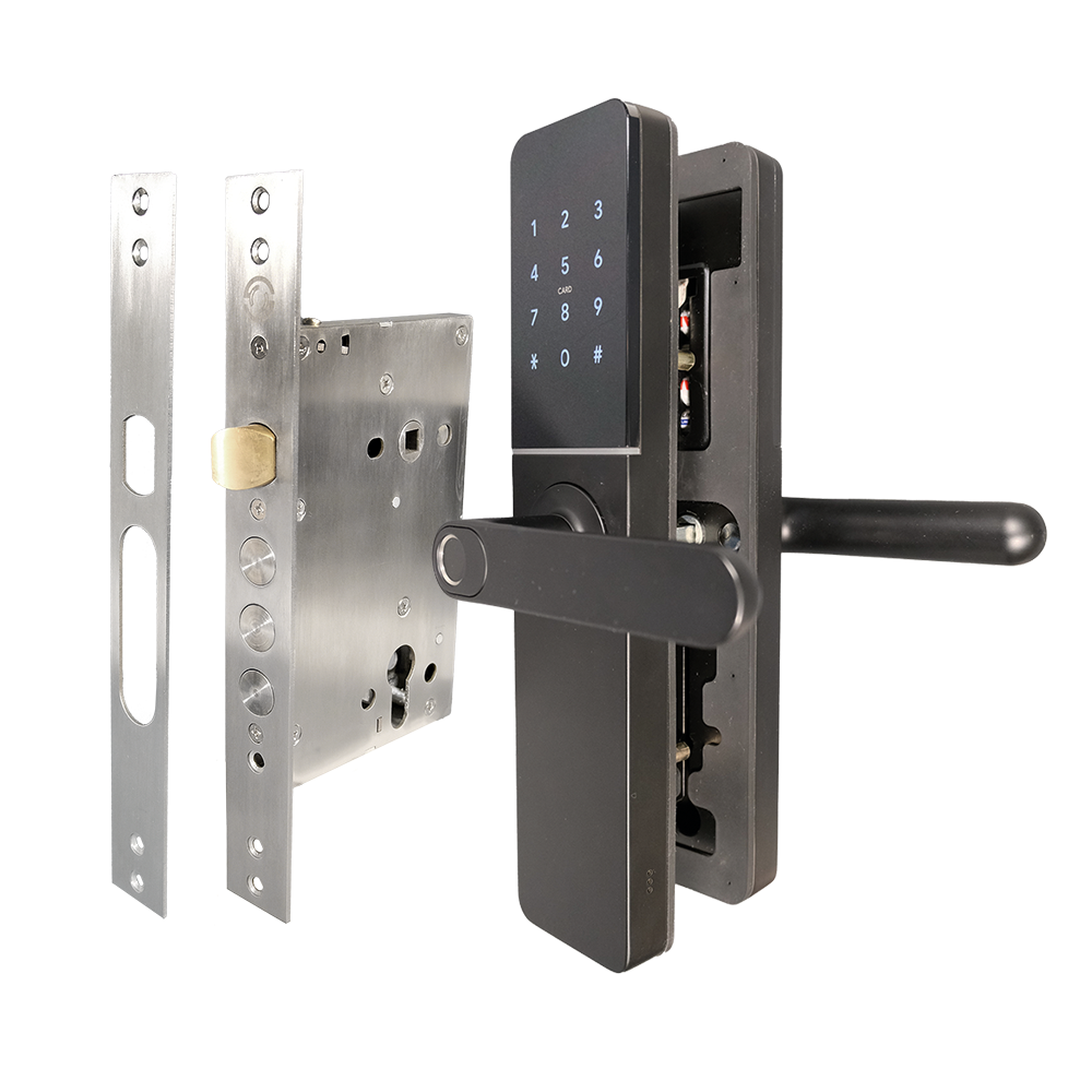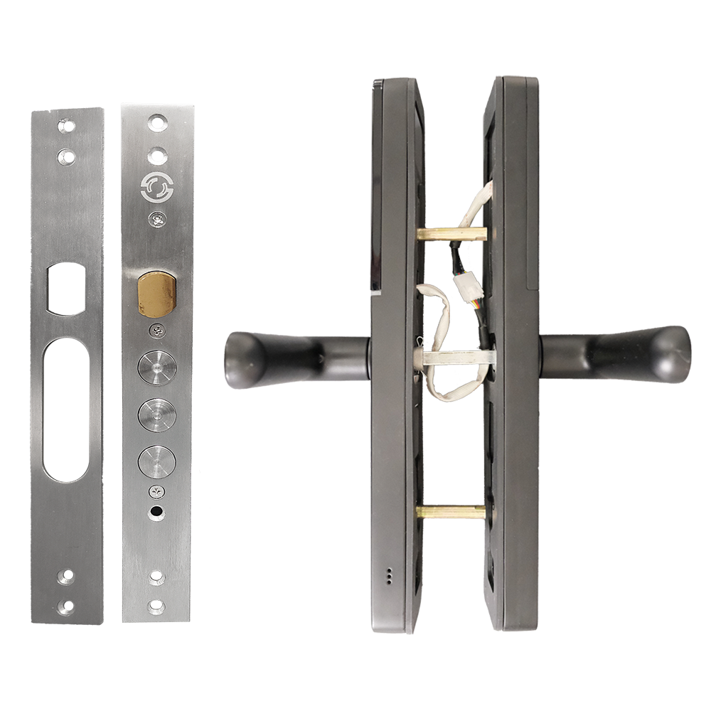 Комплект состоит из врезного механического замка и ручек-накладок со встроенной электроникой.