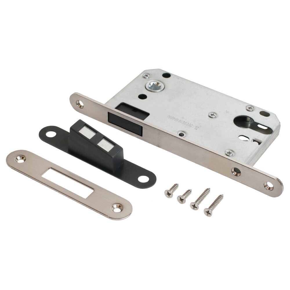 Универсальный магнитный врезной замок для установки на деревянные межкомнатные двери. Материал - сталь, гальваническое покрытие. Удаление ключевого отверстия - 50 мм. Межосевое расстояние - 85 мм. Овальная торцевая планка. Ширина планки - 18мм. Габариты корпуса - 131х73х15 мм. Засов из ударопрочного пластика. Цилиндровый механизм в комплект не входит.