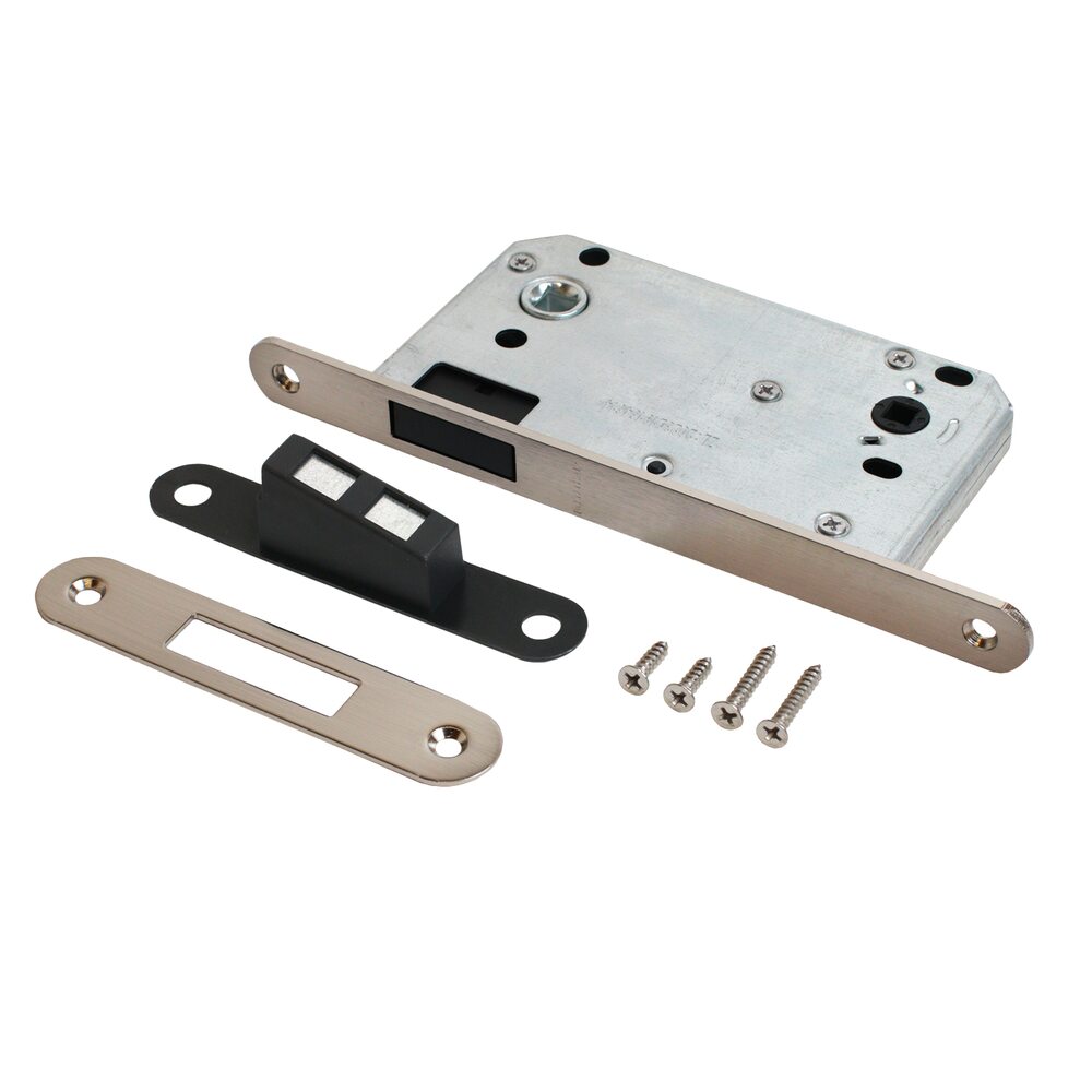 Универсальная врезная защелка со смещенным магнитным ригелем для установки на деревянные межкомнатные двери. Материал - сталь, гальваническое покрытие.